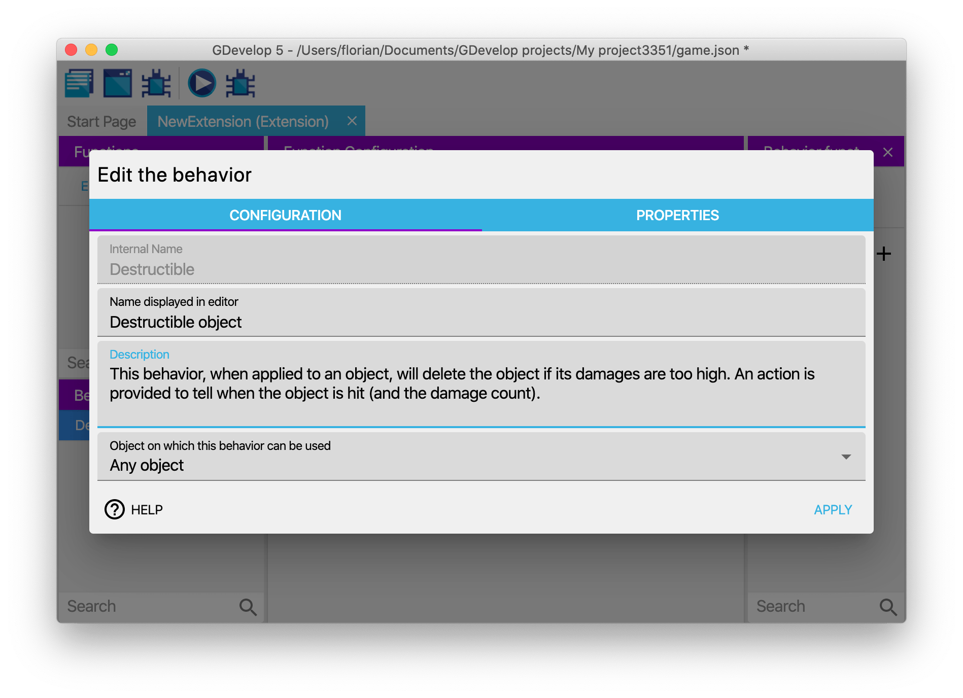 Here, you can see the "Destructible Object" behavior for example (that was created in the previous screenshots):