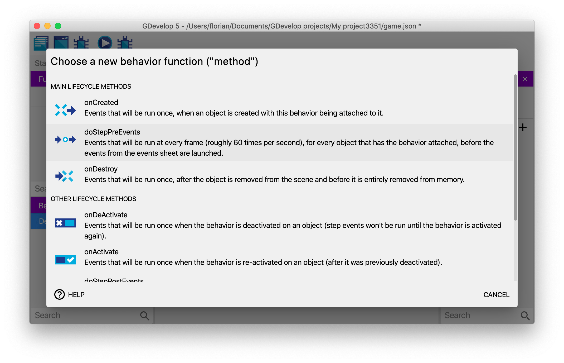 - doStepPostEvents: events that will be run for every single object having the behavior, after the "traditional" events of the scene, if the behavior is not deactivated. Typically, this is done 60 times per second. It's recommended to prefer