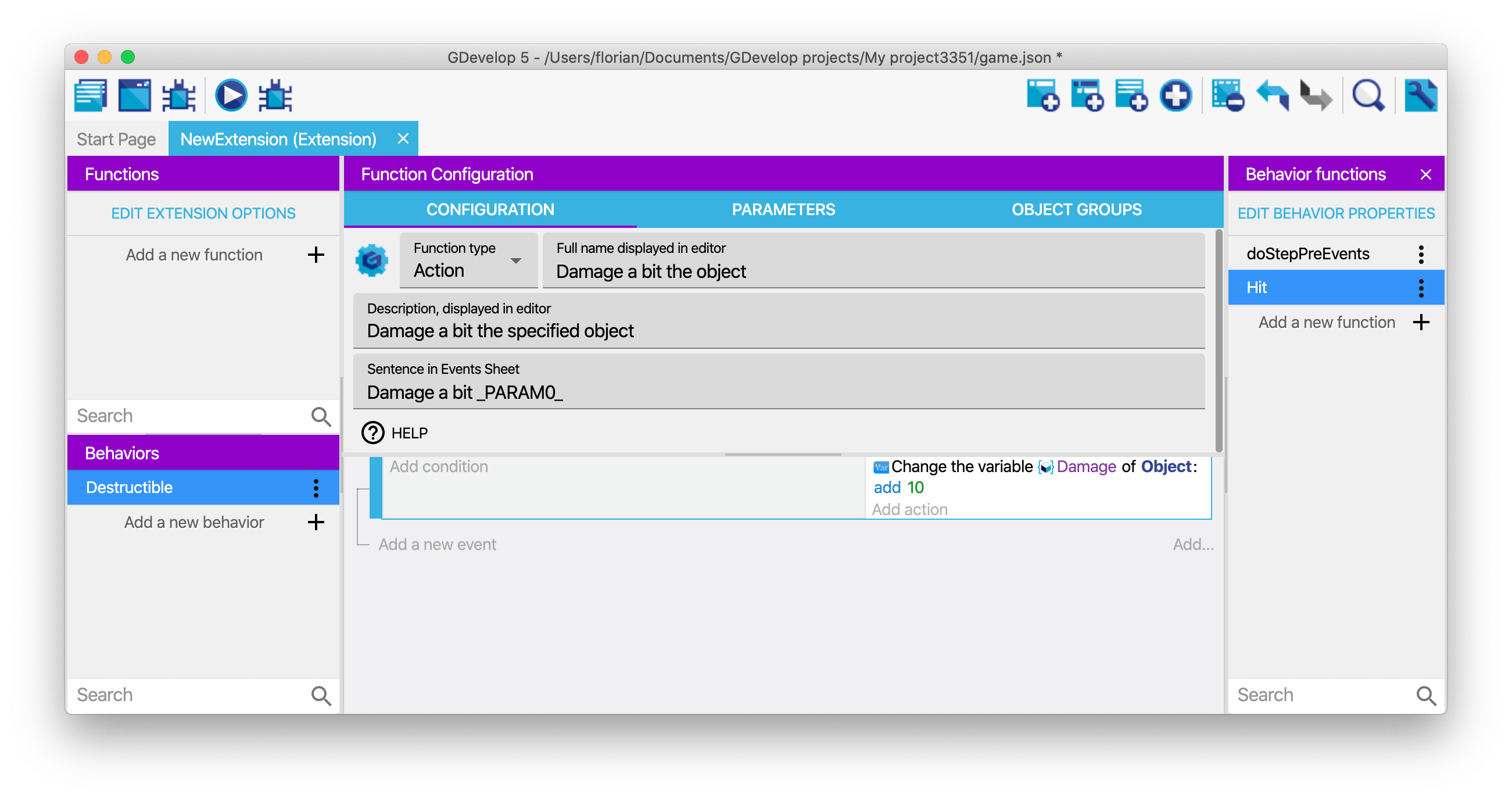 You can run the game and see that the events in the doStepPreEvents function (or doStepPostEvents) will be executed. In the example of the Destructible behavior that was created, if the "Damage" variable is set to a number greater or equal to 100, the object will be destroyed automatically.