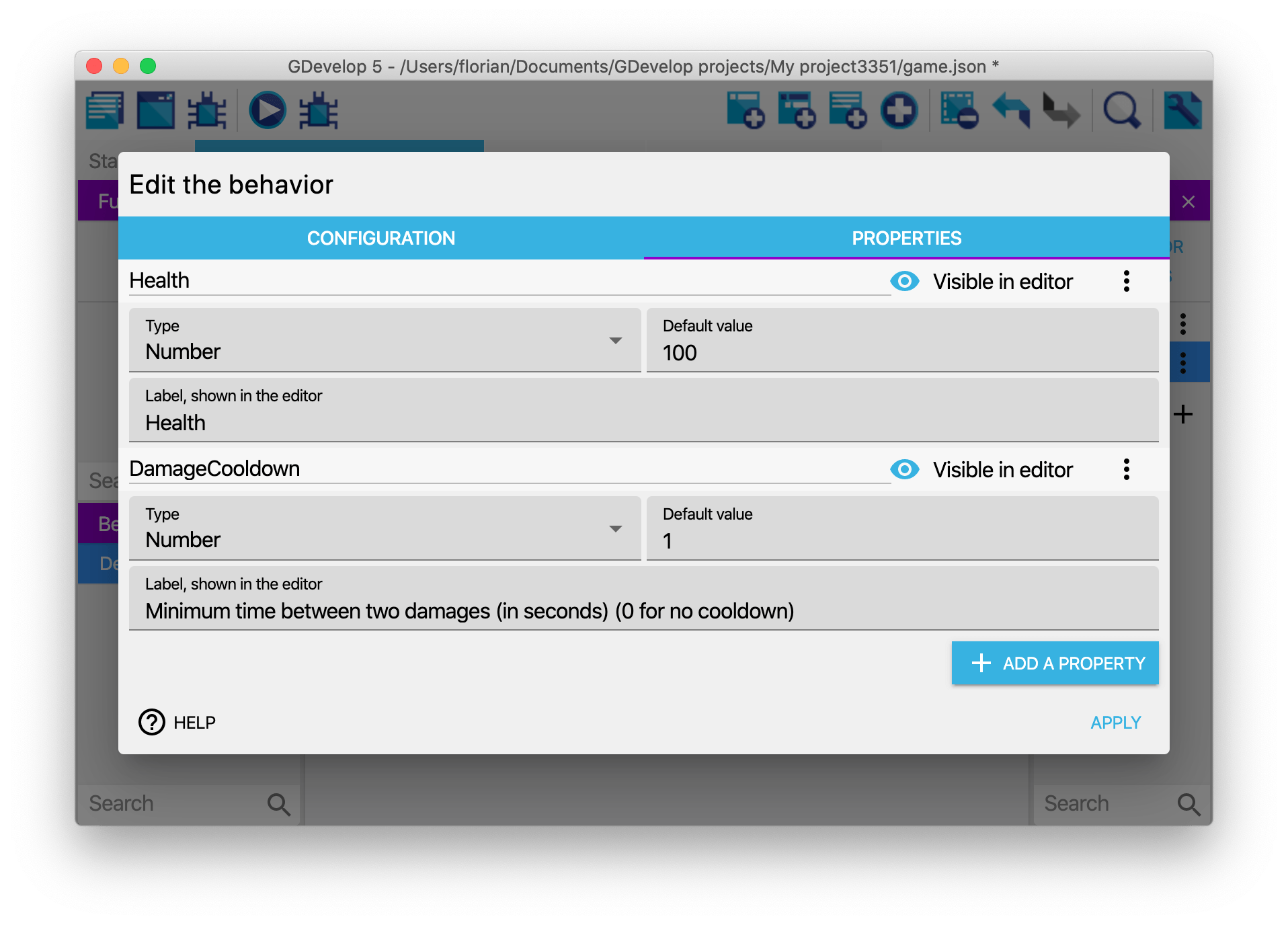 To show and add properties to your behavior, edit it and click on the "Properties" tab. In this example, you can see a behavior called "Health" that has properties to store the health of the object and the minimum time between two hits on the object: