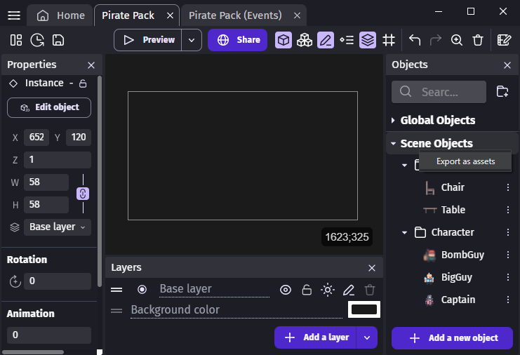 GDevelop streamlines the integration of assets into game projects, eliminating the need for manually editing the assets. To ensure seamless compatibility with the asset store, submitted art must adhere to specific technical requirements. These constraints are easily managed within the engine: simply create objects with your art, configure the objects appropriately, and GDevelop will handle the necessary processing to export your assets in a .gdo file format ready for the asset store.