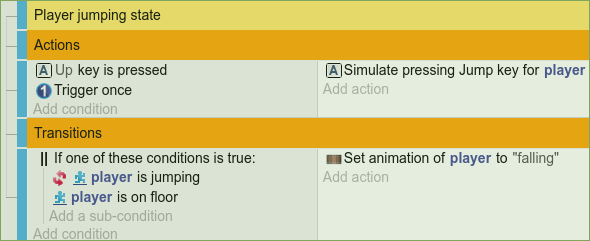 Instead of the animation, we could have created here a dedicated Scene Variable "state" to control the player state. This is more advanced but allows for better flexibility. However, the approach presented here has the benefit of bundling the logic with the corresponding animation, allowing for clarity and simplicity in the event sheet. Furthermore, you have access to the frames of the current animation/state and can trigger some logic at a certain frame inside the animation.