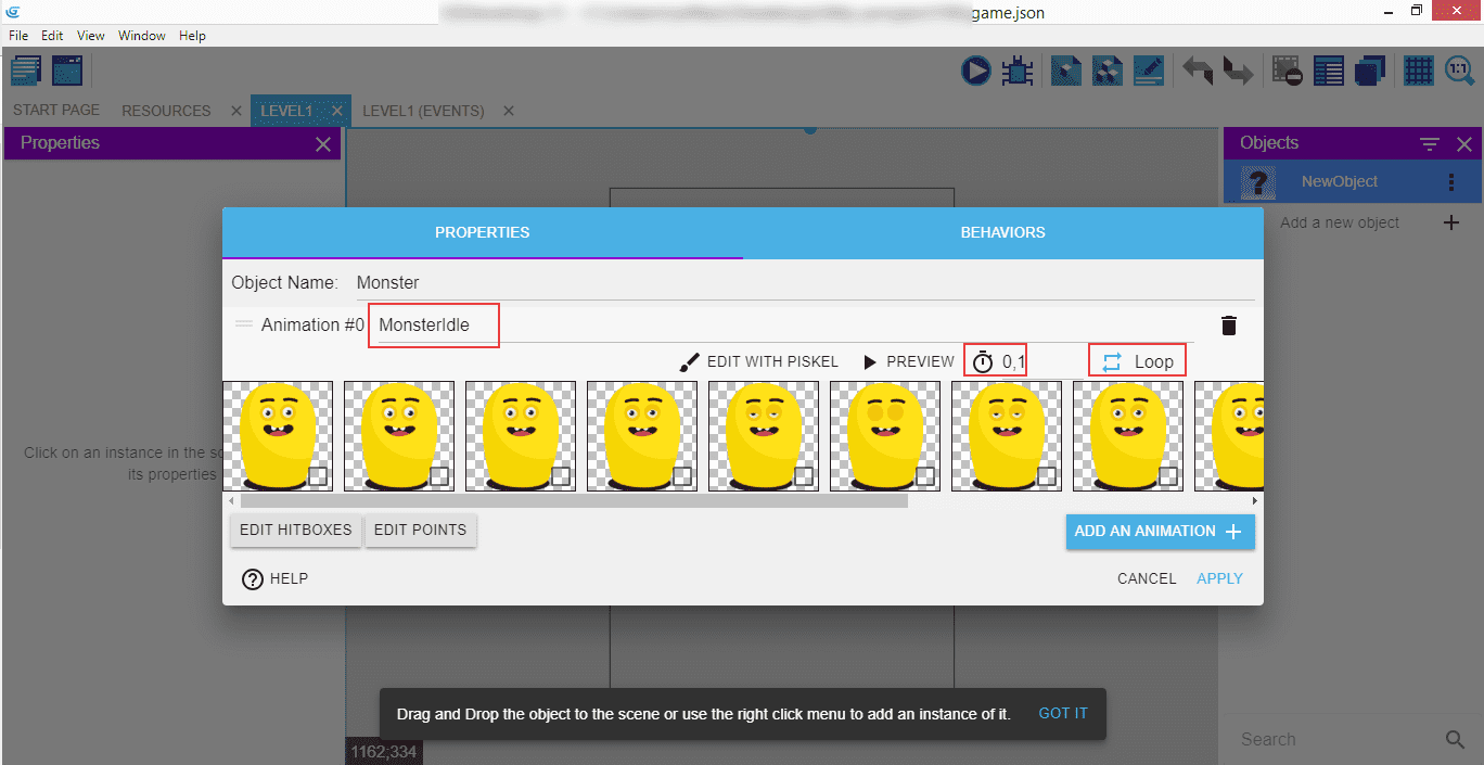 Another popup will appear, but now with the options to customize our new object. We will call him "Monster", and he will be our main character in the game: collecting items and being cute at the same time.
